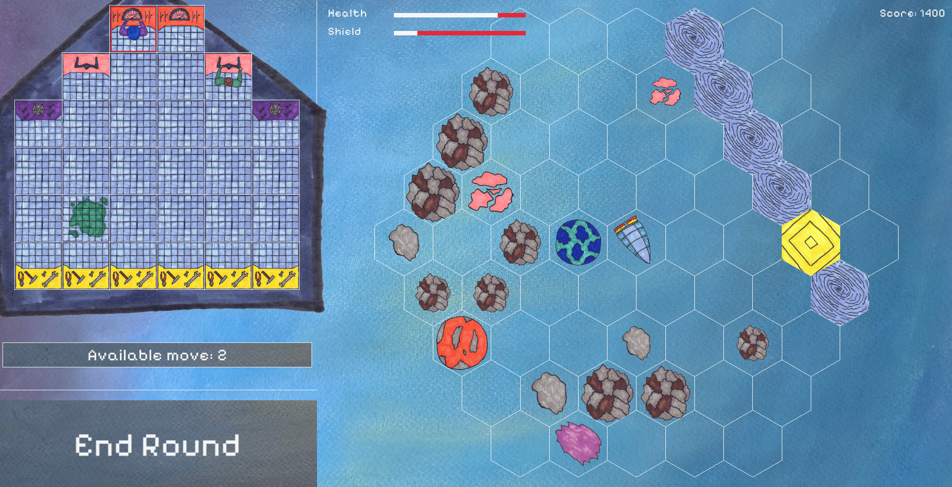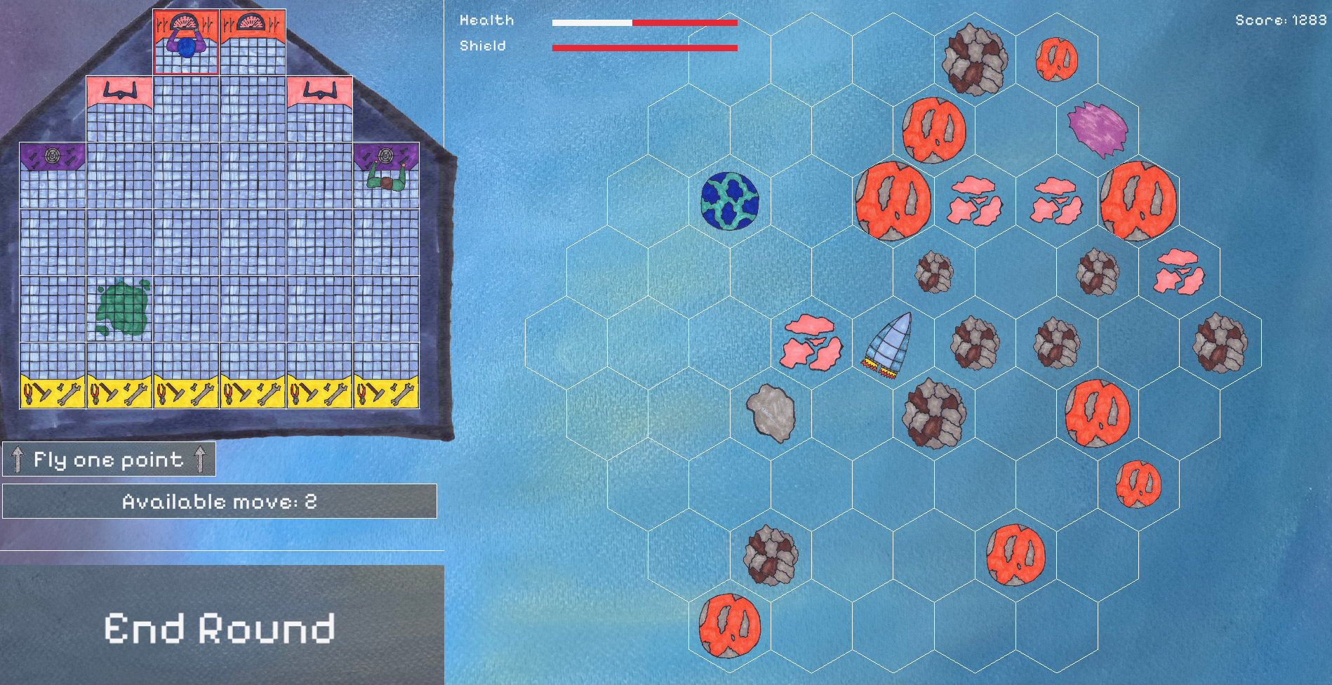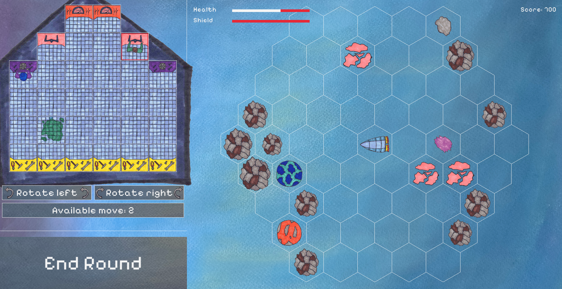 Spaceship delivery is turn-based game in which you control spaceship crew. There's only one action and two fields move available for each crew member every round. You can fly, rotate, fire to rock or repair broken shield to reduce future damages.